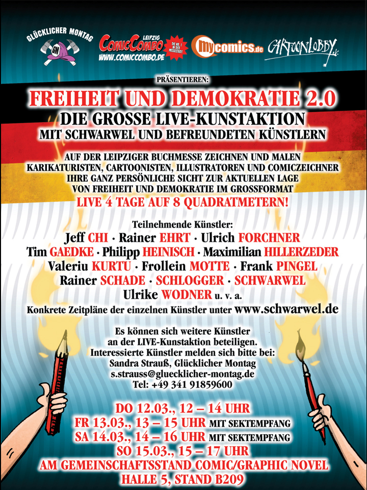Auf der Leipziger Buchmesse 2015 malen Schwarwel und befreundete Künstler ihre Sicht zur aktuellen Lage von Freiheit und Demokratie im Großformat