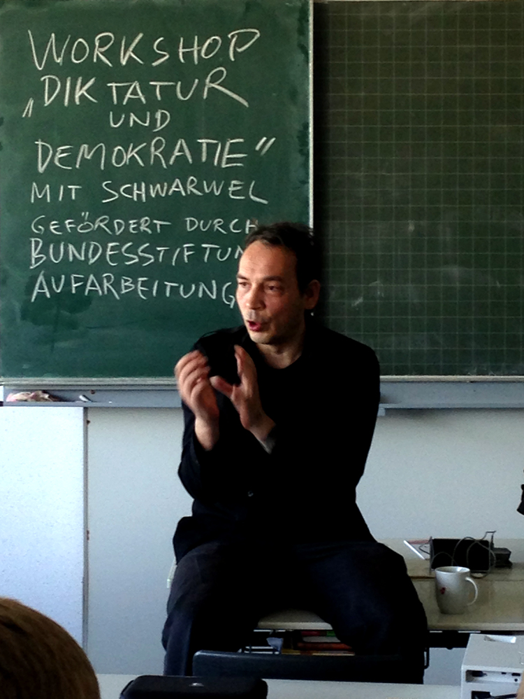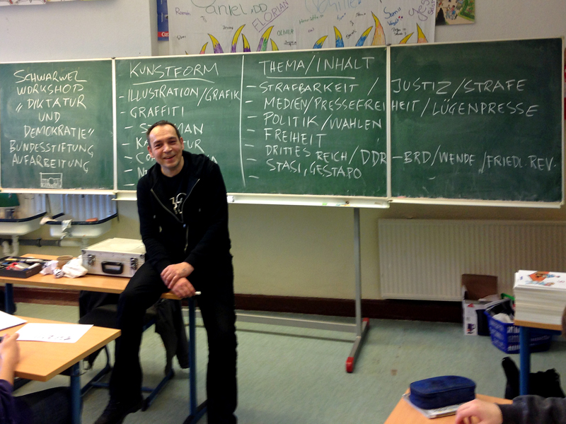 Umso wertvoller waren und sind die eingesetzten Arbeitsmittel, die in Verbindung mit den eigenen Erfahrungen des Regisseurs und Zeitzeugen und gleichzeitigen Workshopleiters Schwarwel den Schülern die Lebendigkeit und Gültigkeit der Themen für die heutige Zeit und ihr eigenes Leben eindringlich machten.