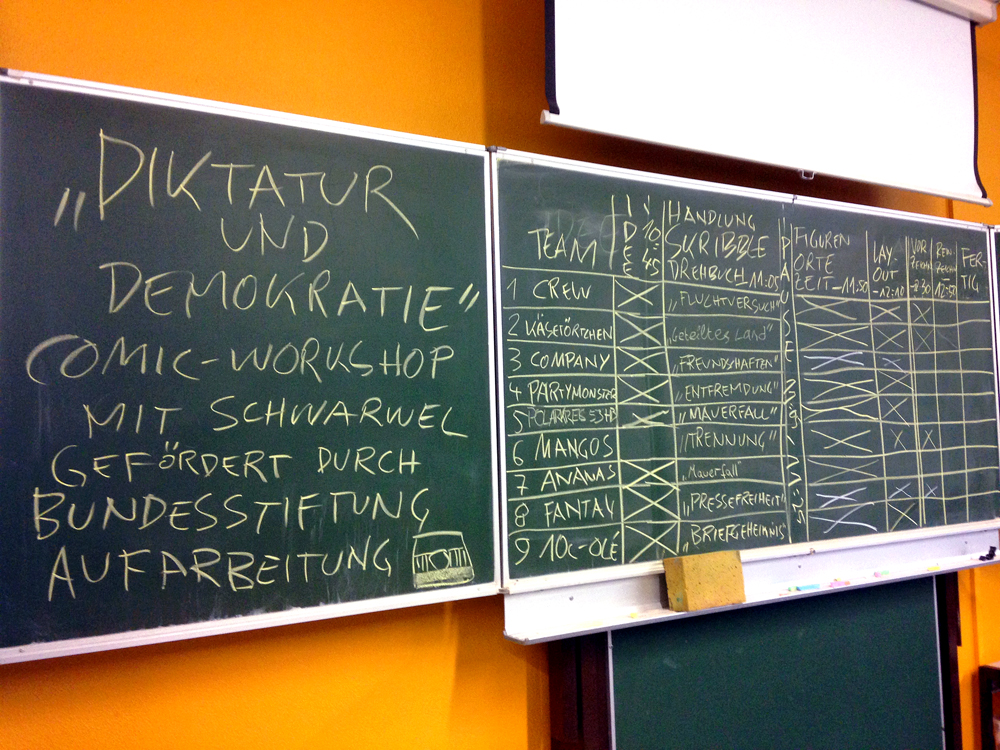 Je nach Zielsetzung (Comic oder Film) wurden danach Teams zwischen 2 und 6 Teammitgliedern gebildet, die ab jetzt in Gruppenarbeit und auf demokratischer Basis ihre Inhalte selbst erarbeiteten und dafür neben unserem Buch „1989 – Unsere Heimat …“ und dem zur Verfügung gestellten Lehrmaterial vor allem im Internet recherchieren sollten und konnten.