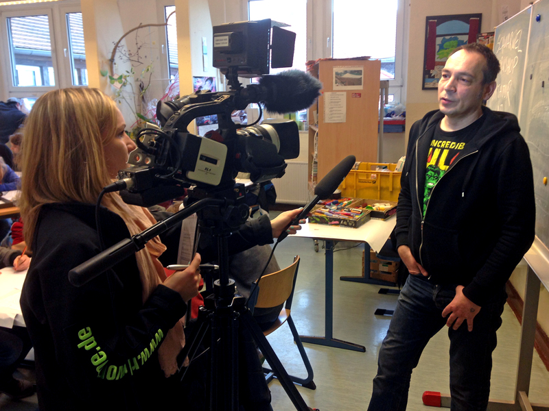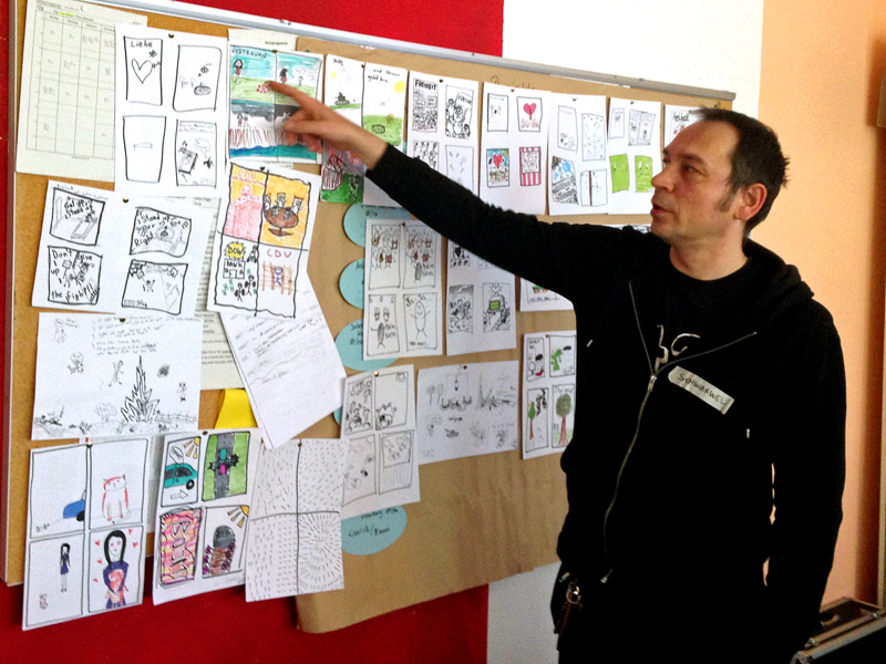 Mit unserem mitgebrachten Film hatten wir einen guten Opener und die Aufmerksamkeit auf unserer Seite. Der Regisseur des Filmes Schwarwel leitete die Workshops, so dass gleichzeitig ein authentischer Zeitzeuge mit den Schülern ihre Comics und/oder kurzen Filme erarbeitete statt „nur“ einen Vortrag zu halten.