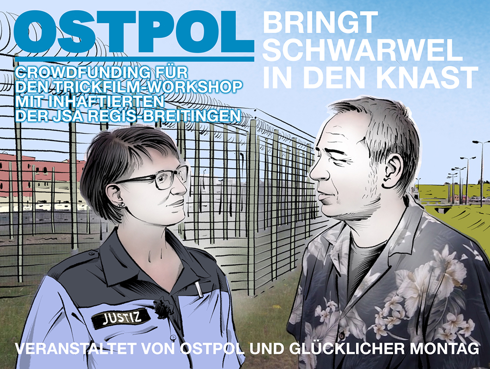 Schwarwel: Eine Untertützung unseres Workshops via Crowdfunding würde den Workshop überhaupt erst finanzieren und möglich machen. Die DOK Leipzig stellt die Premieren und unterstützt uns logistisch, OSTPOL selbst geht gerade mit der JSA-Kunsttherapeutin und uns zusammen personell, planungstechnisch und ideell weit in Vorleistung, um dieses Workshop-Angebot mit sicht- und erlebbaren Film-Ergebnissen möglich zu machen.