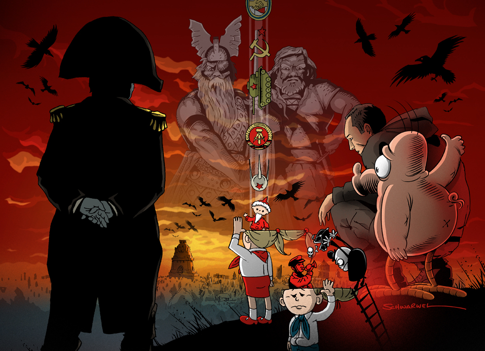 Schwarwel: Eher Letzteres. Das ging mir alles zu fix. Helmut Kohl wollte seine sehr wackelige Kanzlerschaft retten und hat die sich bietende Gelegenheit nach dem Mauerfall konsequent genutzt. Leider haben das zu wenig Ostler auch so gesehen und sie wollten gleich an den großen Kuchen ran. Die versprochenen „blühenden Landschaften“ vermisse ich noch heute, weshalb unsere „Lieder der Heimat“ eben Gestalt angenommen haben. Das Deutschland von heute ist aus der Friedlichen Revolution und dem Mauerfall erwachsen. Eine Frau Merkel oder ein Herr Gauck würde es ohne diese flotte Wiedervereinigung heute wohl eher nicht geben.