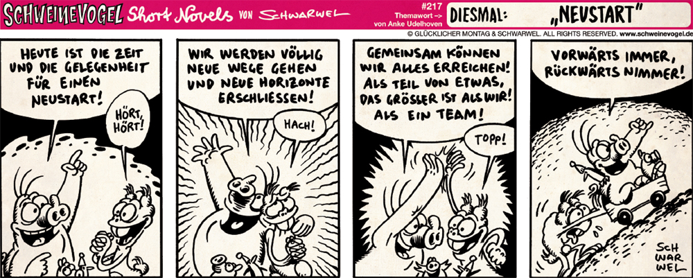 Es ist mir daher auch unmöglich, ihn oder seine Mitstreiter adäquat zu beschreiben, ohne ins Uferlose abzudriften. Wenn ich an den Strips oder anderen Schweinevogel-Sachen sitze, weiß ich exakt, wer was in welchem Duktus sagt und wie die einzelnen Charaktere folgerichtig handeln werden und welche Pointe ich mir gleich abschminken kann, aber das in eine knappe, fesche Pressemitteilung zu bekommen, sehe ich mich einfach nicht in der Lage.