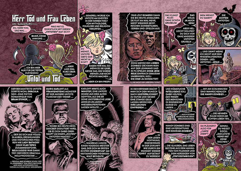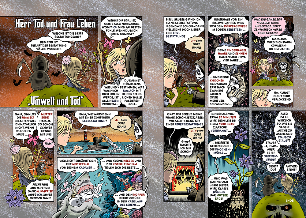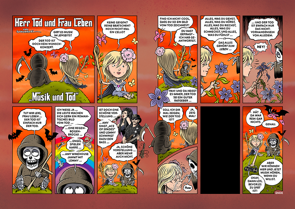 Herr Tod und Frau Leben-Comics für das Endlichkeitsmagazin drunter+drüber der FUNUS Stiftung ab der Ausgabe 14 zu den jeweiligen Titelthemen.