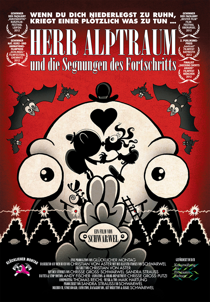„Herr Alptraum und die Segnungen des Fortschritts“ begann als Bilderbuch, dessen Verse Autor Christian von Aster seinem langjährigen Künstlerfeund Schwarwel zum Illustrieren gab, nachdem sie mit „Höllenherz“, „Timmy kennt den Weihnachtsmann“, „10 kleine Grufties“ u. a. bereits einige gemeinsame Projekte realisiert hatten.
