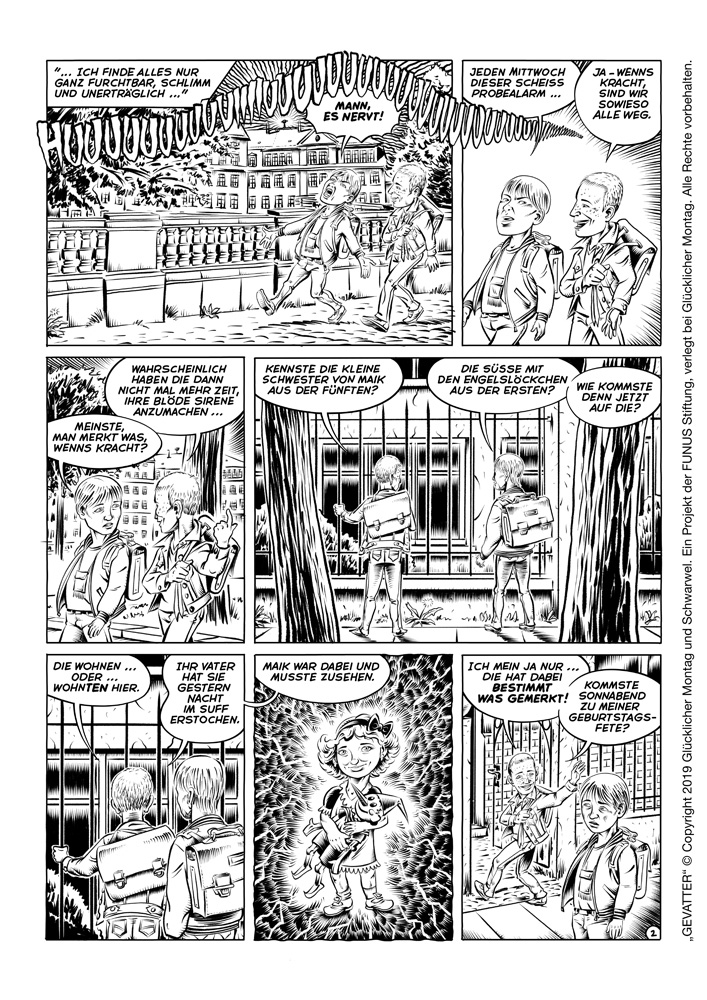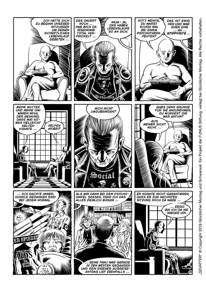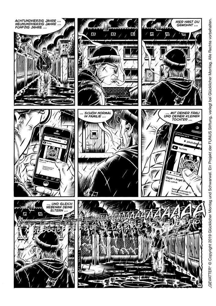 In poetischen und fein geschnittenen Bildern schildert Schwarwel dunkle ebenso wie erhellende Aspekte seines Erlebens mit dem Tod. Um sich dabei für einen gesünderen und normaleren Umgang mit dem Tod einzusetzen, der oftmals tabuisiert und an den Rand der Gesellschaft gedrängt wird. Mehrfach hat der 1968 in Leipzig geborene Comickünstler auf seine Biografie zurückgegriffen. Die Trickfilme „1989 – Unsere Heimat, das sind nicht nur die Städte und Dörfer“ und „Leipzig von oben“ sind davon geprägt. Wie diese kombiniert „Gevatter“ Facetten von Schwarwels Erinnerung mit Zeit- und Lokalkolorit. Da werden der Konformitätsdruck der DDR-Lebenswelt greifbar und der Fluchtpunkt Subkultur in all seiner Freiheit und Fatalität im Drogenumgang. Immer wieder ragt das Leipziger Völkerschlachtdenkmal in die Geschichte. In dessen Schatten wuchs Schwarwel auf, weshalb das monströse Monument ein Wegbegleiter durch sein Schaffen ist. Wie das Trauma des Todes – und der Gevatter jedes Menschenleben begleitet.