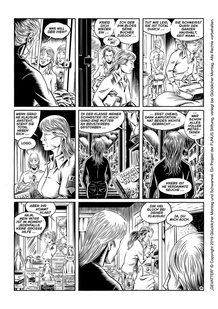 Die Graphic Novel „Gevatter“ von Schwarwel ist eine autobiografische Erzählung, in der uns der Autor und Zeichner mitnimmt auf eine Reise in seine Innenwelt und seine Erinnerungen, um uns an seiner ureigenen Auseinandersetzung mit dem Sterben und dem Tod und seinen Ängsten davor teilhaben zu lassen.
