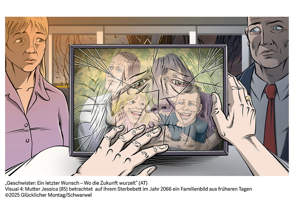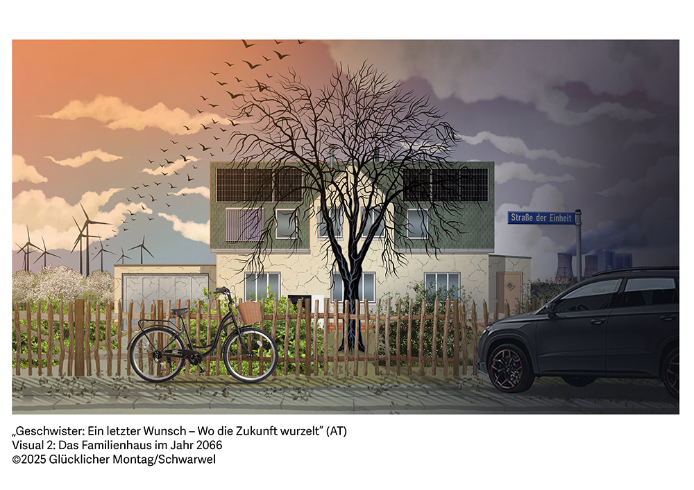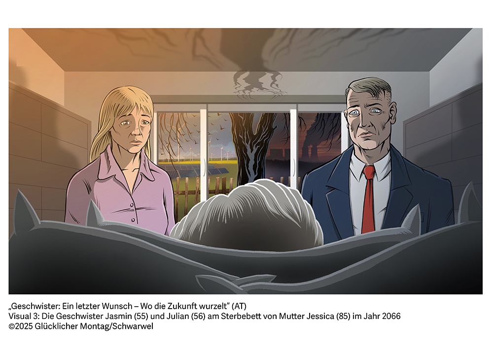 Mitteldeutschland im Jahr 2066: Im Wohnzimmer eines alten Einfamilienhauses liegt die schwerkranke Mutter Jessica (85), einst Gymnasiallehrerin, doch nun von ihren Kräften verlassen, auf ihrem Sterbebett. Ihr letzter Wunsch ist ein schlichter, aber beinahe unmöglicher: Sie möchte ihre erwachsenen Kinder Jasmin (55) und Julian (56), die sich seit Jahrzehnten politisch wie menschlich völlig entfremdet haben, nochmals vereint sehen. Seit dem plötzlichen Tod ihres Vaters Jan (*1979, Maurermeister mit eigenem Kleinunternehmen) im Jahr 2026 haben sich die damals 15- und 16-jährigen Geschwister in ihren Weltansichten und Lebensweisen in vollkommen unterschiedliche Richtungen entwickelt: Jasmin wurde Transformationsforscherin und Nachhaltigkeitsexpertin in einer progressiven Welt, Julian wurde Malermeister, Kleinunternehmer und rechtspopulistischer Lokalpolitiker in einem autoritär-patriarchalen Leben.