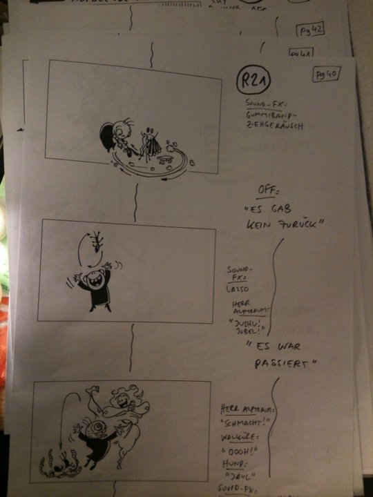 Herr Alptraum freut sich, dass ich allen heutigen Widernissen zum Trotz die 50%-Marke seines Storyboards geknackt habe. Noch 42 von 85 Seiten to go.