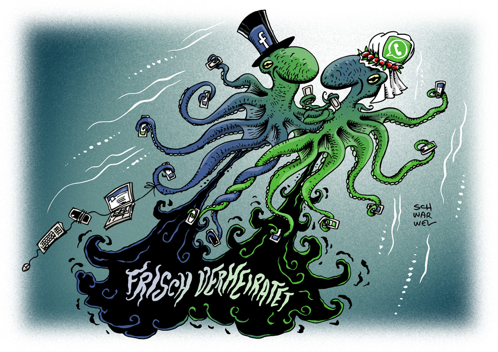 Facebook schluckt Whatsapp: Hochzeit der Datenkraken - Karikatur Schwarwel Ukraine: Keine Waffenruhe und weitere Tote in Kiew - Karikatur Schwarwel