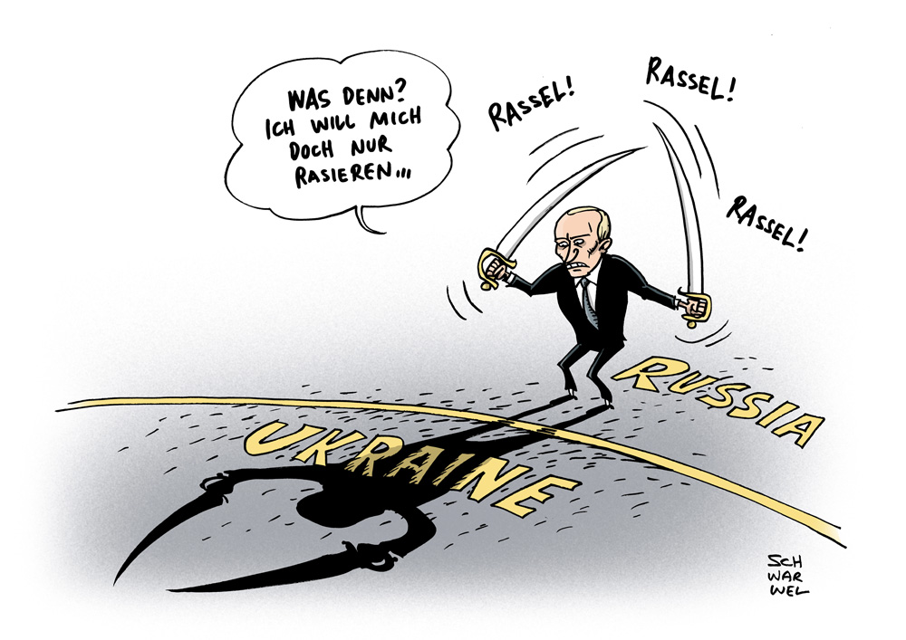 Europawahl: Karlsruhe kippt mit Urteil Drei-Prozent-Hürde - Karikatur Schwarwel Ukraine: Putin demonstriert Stärke und russische Armee prüft Einsatzbereitschaft - Karikatur Schwarwel