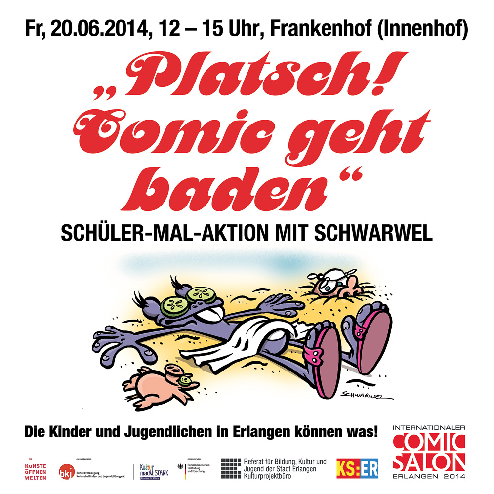 Wer sich davon überzeugen will, ist bei der Ausstellungseröffnung von „Comic geht baden“ genau richtig: Im Rahmen der Ausstellung der Workshop-Ergebnisse von Erlanger SchülerInnen zum 16. Comic-Salon Erlangen erschaffen die Nachwuchstalente live und in Farbe gemeinsam mit dem Leipziger Comickünstler Schwarwel ein neues, exklusives Werk im gigantischen Ausmaß von 3,50 Metern Breite und 2 Metern Höhe!