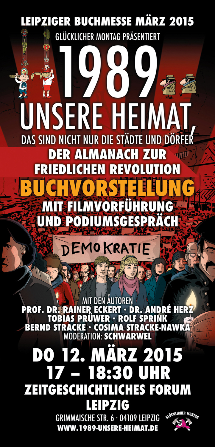 Do 12.03., 17 – 18:30 Uhr „1989 – Unsere Heimat, das sind nicht nur die Städte und Dörfer – Der Almanach zur Friedlichen Revolution“ – Buchvorstellung mit Filmvorführung und Podiumsgespräch mit den Autoren Prof. Dr. Rainer Eckert, Dr. André Herz, Tobias Prüwer, Rolf Sprink, Bernd Stracke, Cosima Stracke-Nawka – Moderation: Schwarwel – Zeitgeschichtliches Forum Leipzig