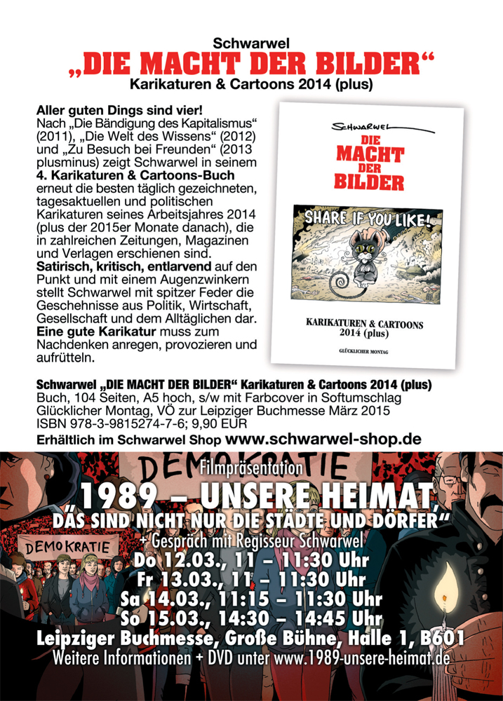 Do 12. – So 15.03., 10 – 18 Uhr Glücklicher Montag mit Verlagsprogramm + VÖ Buch „Die Macht der Bilder – Karikaturen & Cartoons 2014 (plus)“ von Schwarwel am Gemeinschaftsstand Comic/Graphic Novel Halle 5, B209