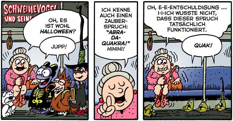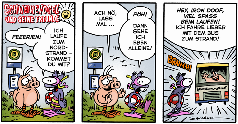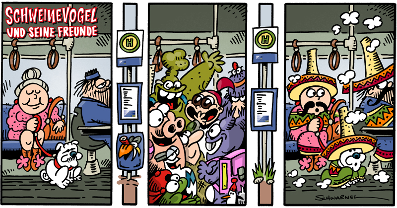 10 Schweinevogel-Comicstrips von Schwarwel, VÖ: Hausaufgabenheft der Leipziger Verkehrsbetriebe 2013/2014
