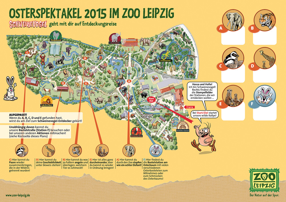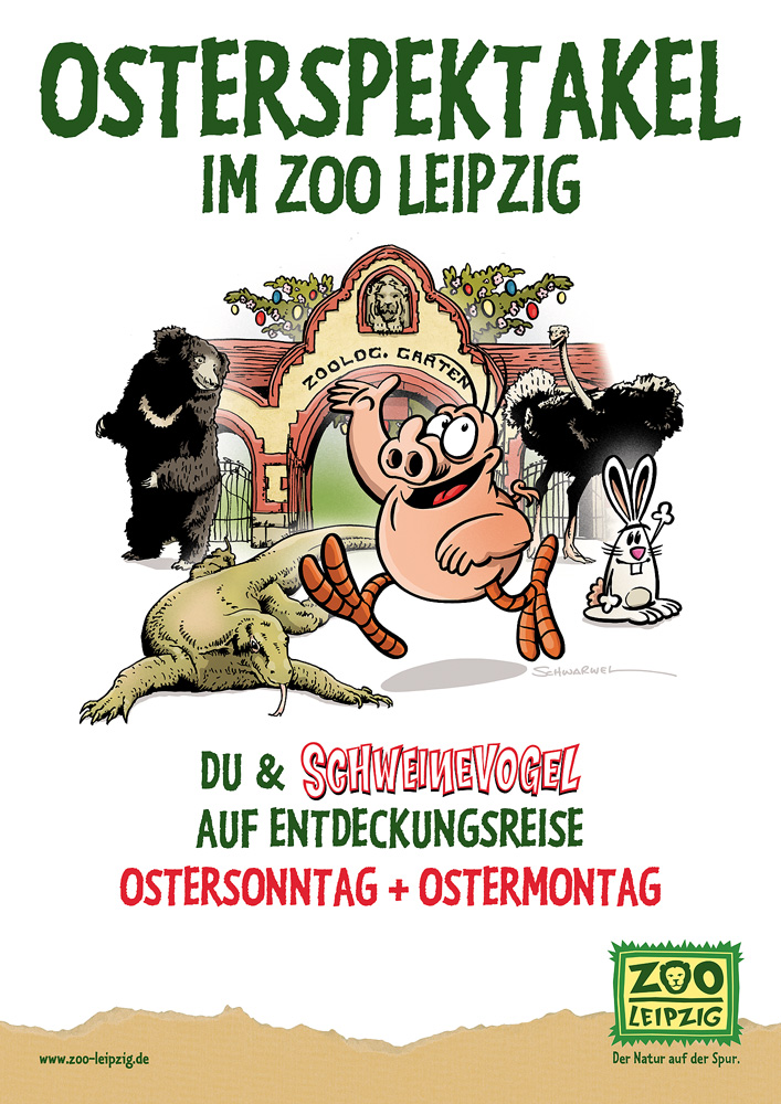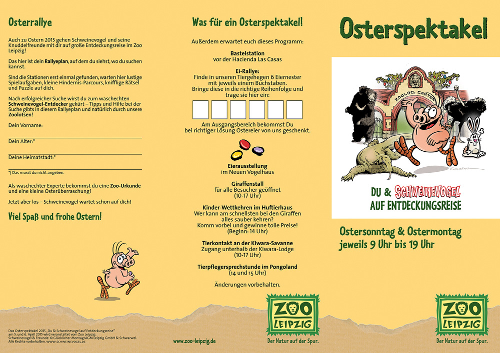 Weil ihr und wir in den letzten Jahren mit Groß und Klein so viel Spaß dabei hatten, gehen Schweinevogel und seine Knuddelfreunde zu Ostern 2015 mit dir wieder auf große Entdeckungsreise im Zoo Leipzig!