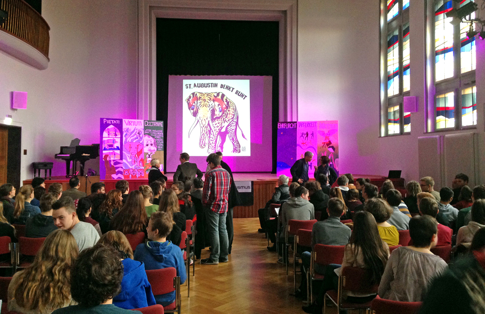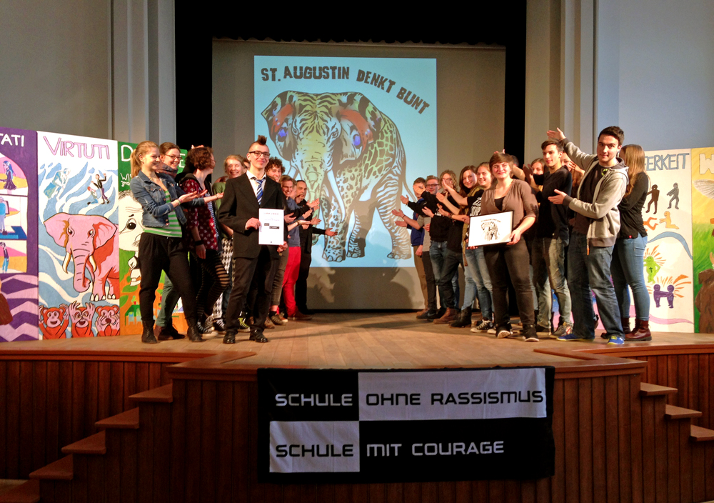 Im Jahr 2014 entstand im Schülerrat des Gymnasiums St. Augustin die Idee, das Projekt „Schule ohne Rassismus – Schule mit Courage“ durchzuführen. Im Rahmen dieses Projektes sollen an der Schule regelmäßig Workshops und Informationsveranstaltungen zu Themen wie Rassismus, Sexismus, Homophobie und andere Formen der Diskriminierung stattfinden. Um den Titel zu erhalten, müssen mindestens 70 % der Menschen, die an der Schule lernen oder arbeiten (Schüler, Lehrer, technisches Personal wie Hausmeister und Reinigungskräfte) eine Erklärung unterschreiben, in der sie sich dazu verpflichten, gegen jegliche Form von Diskriminierung aktiv einzuschreiten. An der ehemaligen Fürstenschule in Grimma konnten wir mit über 90 % Unterschriften einen großen Erfolg verbuchen. Bereits vor der eigentlichen Titelverleihung wurde von Mitgliedern der SoR-SmC-Organisationsgruppe „St. Augustin denkt bunt“ in den neunten Klassen eine Workshopreihe zum Thema Asyl durchgeführt, die unter anderem Informationen zur Situation von Asylbewerbern in Deutschland und dem Landkreis Leipzig sowie zum Entkräften von typischen Stammtischparolen umfasste.